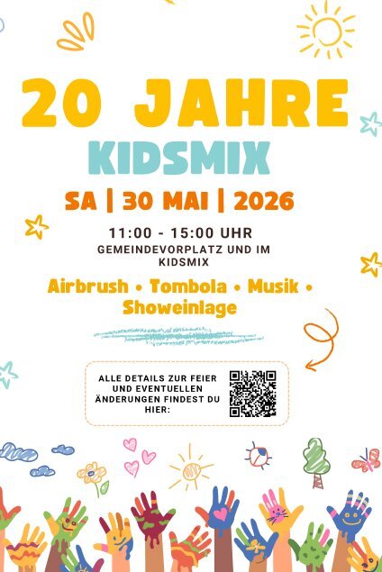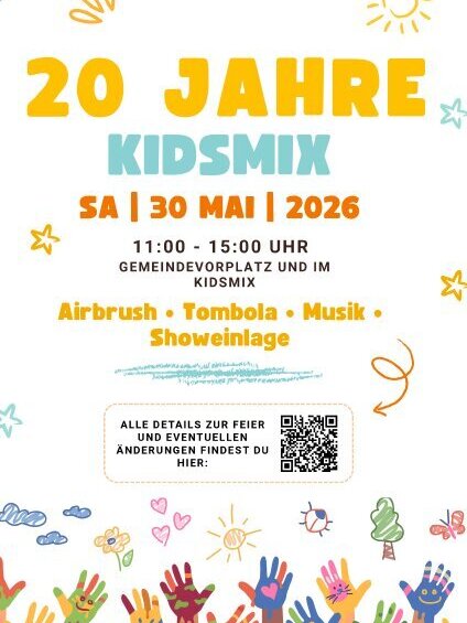 Gefeiert wird am Gemeindevorplatz sowie im Kidsmix, wo ein buntes Programm für Groß und Klein auf Euch wartet.
