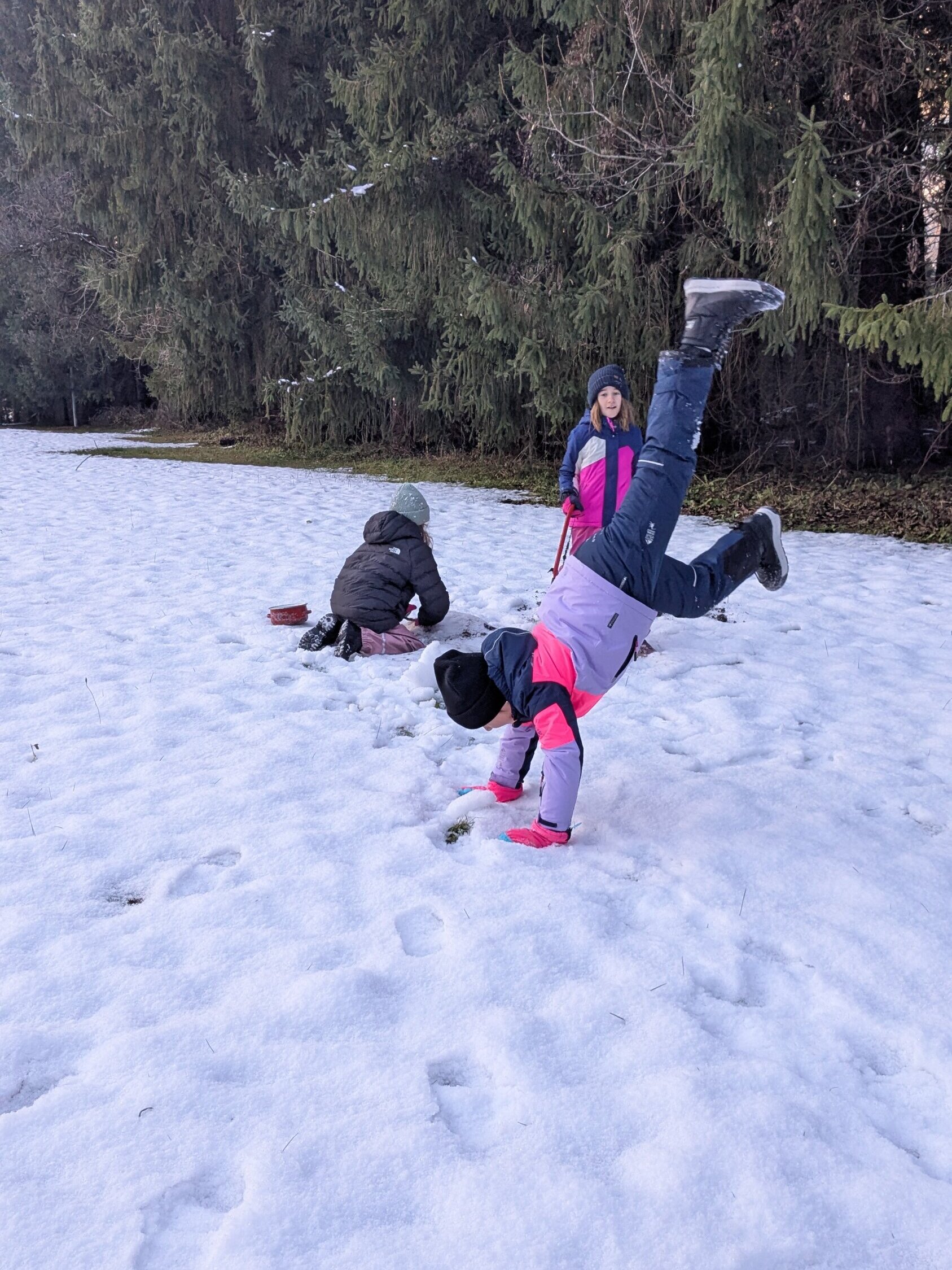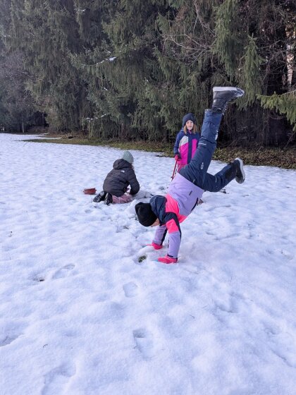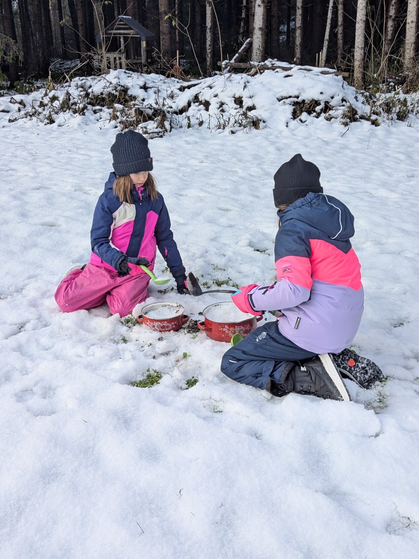 Dank des frisch gefallenen Schnees hatten die Kinder im Wald jede Menge Spaß. Es wurde gebaut, gelacht und geforscht – und natürlich entstanden wieder viele kreative Ideen. Besonders beliebt waren diesmal die „Zaubertränke“, die die Kinder aus Schnee und Naturmaterialien mischten. Am Kamin wurde Schnee zu Wasser geschmolzen, um die Tränke flüssiger zu machen – ein kleines Experimentierhighlight! ❄️