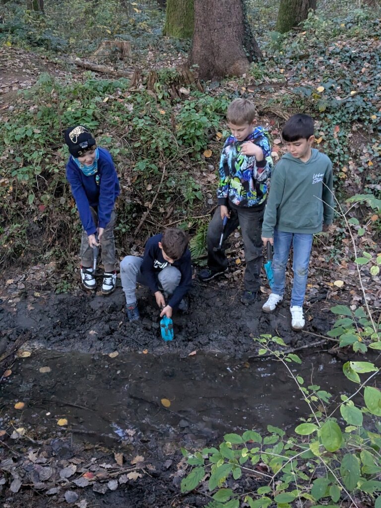 Am Bach ging es anschließend mit echtem Forschergeist weiter. Dort starteten die Kinder kleine Grabungsarbeiten und experimentierten mit Naturmaterialien, um das Wasser auf natürliche Weise zu filtern. Es entstanden kreative Mini-Dämme und selbstgebaute Filterbecken.