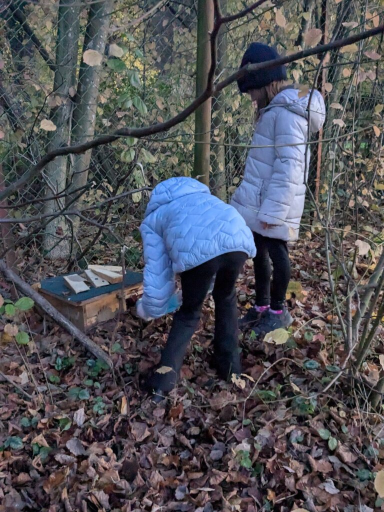 Währenddessen wurde ein weiteres Igelhaus aufgestellt. In der Hoffnung, dass sich bald ein kleiner stacheliger Gast darüber freut, wurden noch Teller mit Futter bereitgestellt.
