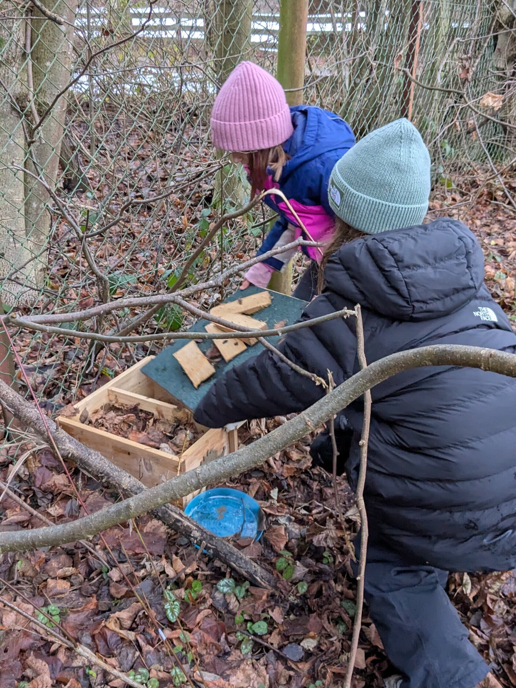Im Wald angekommen mussten wir unsere Pläne für die Futterkrippe leider verschieben. Im neuen Jahr werden wir einen neuen Versuch starten. Trotz gescheiterter Pläne ließen wir uns die Laune nicht verderben. Zu Beginn erneuerten wir das Stroh bei den Igelhäusern und kontrollierten, ob sich vielleicht schon ein stacheliger Gast einquartiert hat. Auch wenn wir keinen Igel entdeckten, war das verschwundene Futter ein deutlicher Hinweis darauf, dass bereits einer vorbeigeschaut hatte.🦔🏠