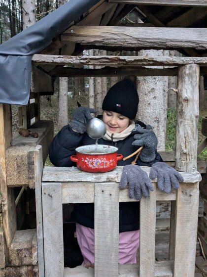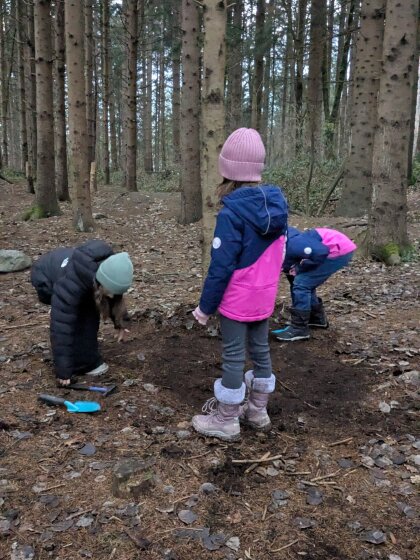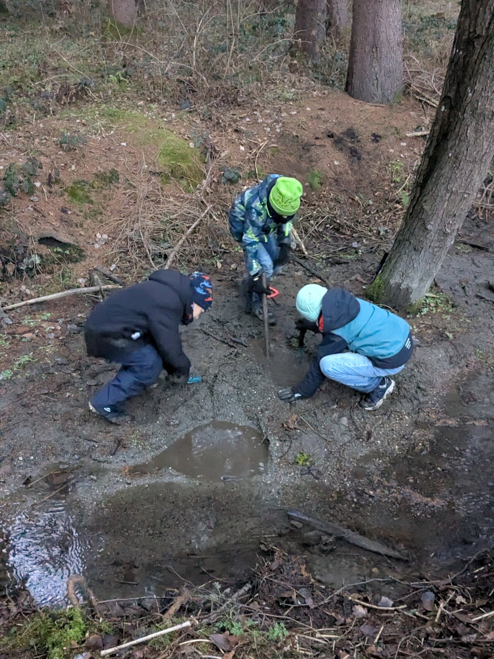 Im Anschluss erkundeten die Kinder den Wald. Sie machten kleine Kochstation, gruben am Bach und versuchten sogar, einen kleinen Eislaufplatz zu gestalten.