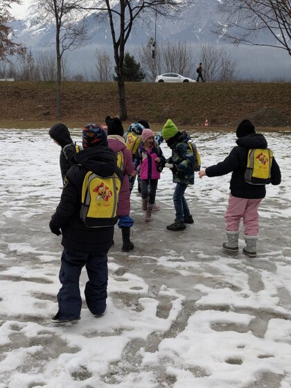 Auf dem Weg entdeckten die Kinder vereiste Stellen in der Wiese. Die glatten Flächen luden dazu ein, kurz stehenzubleiben und darauf ein wenig „Eislaufen“ zu probieren.❄️⛸️