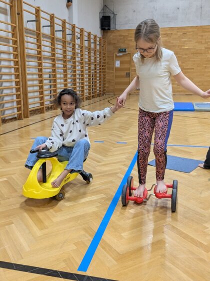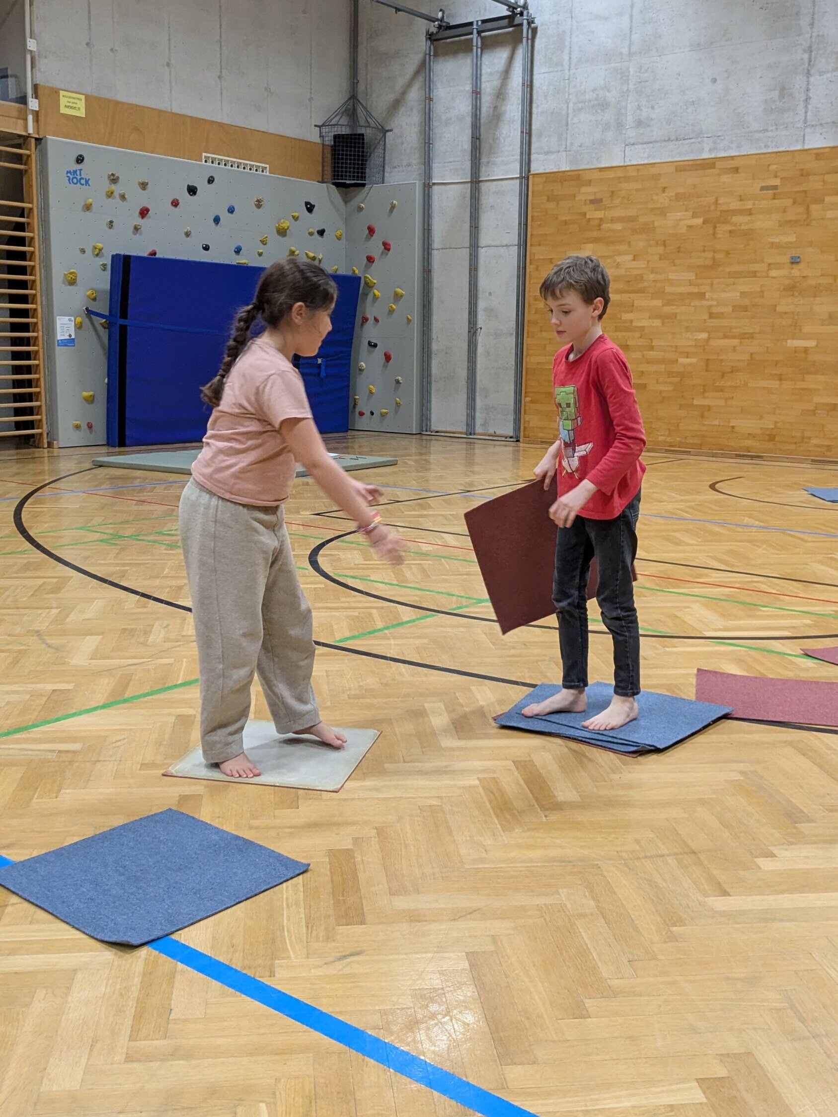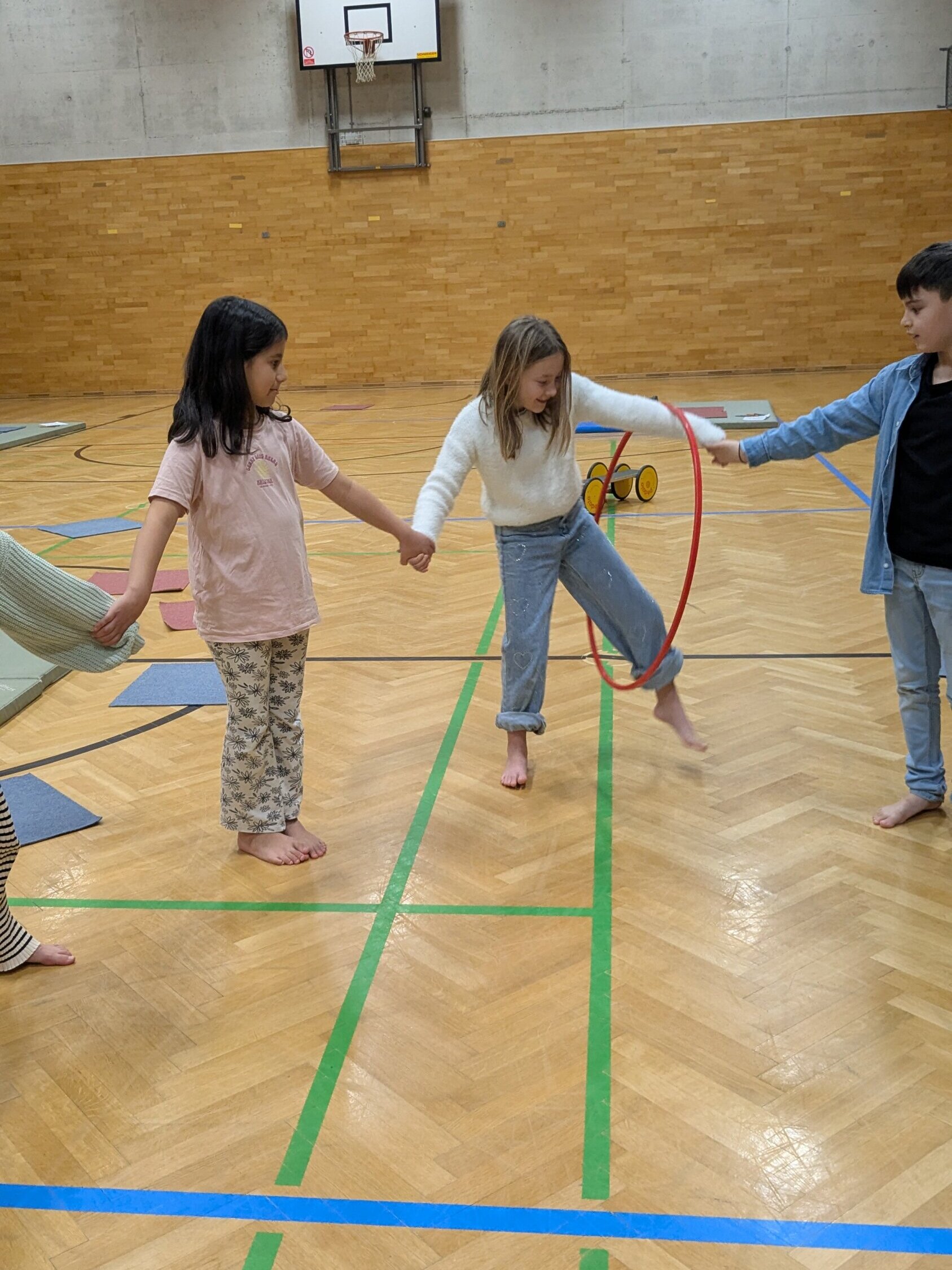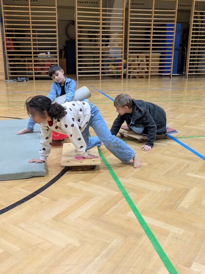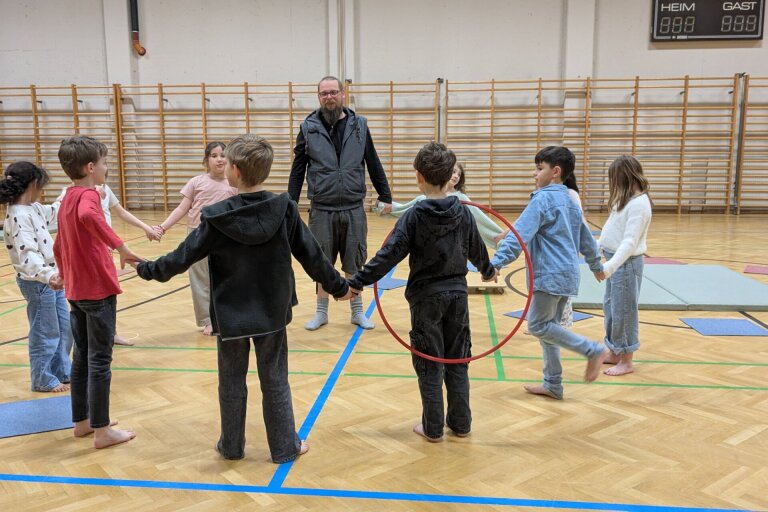 Zum Aufwärmen starteten wir mit einem Geschicklichkeitsspiel, bei dem vor allem Zusammenhalt gefragt war. Die Kinder hielten sich an den Händen und meisterten verschiedene Aufgaben, ohne den Kontakt zueinander zu verlieren. Dabei wurde schnell klar: Nur wenn jede und jeder Einzelne aufmerksam mitmacht und auf die anderen achtet, kann das ganze Team erfolgreich sein.