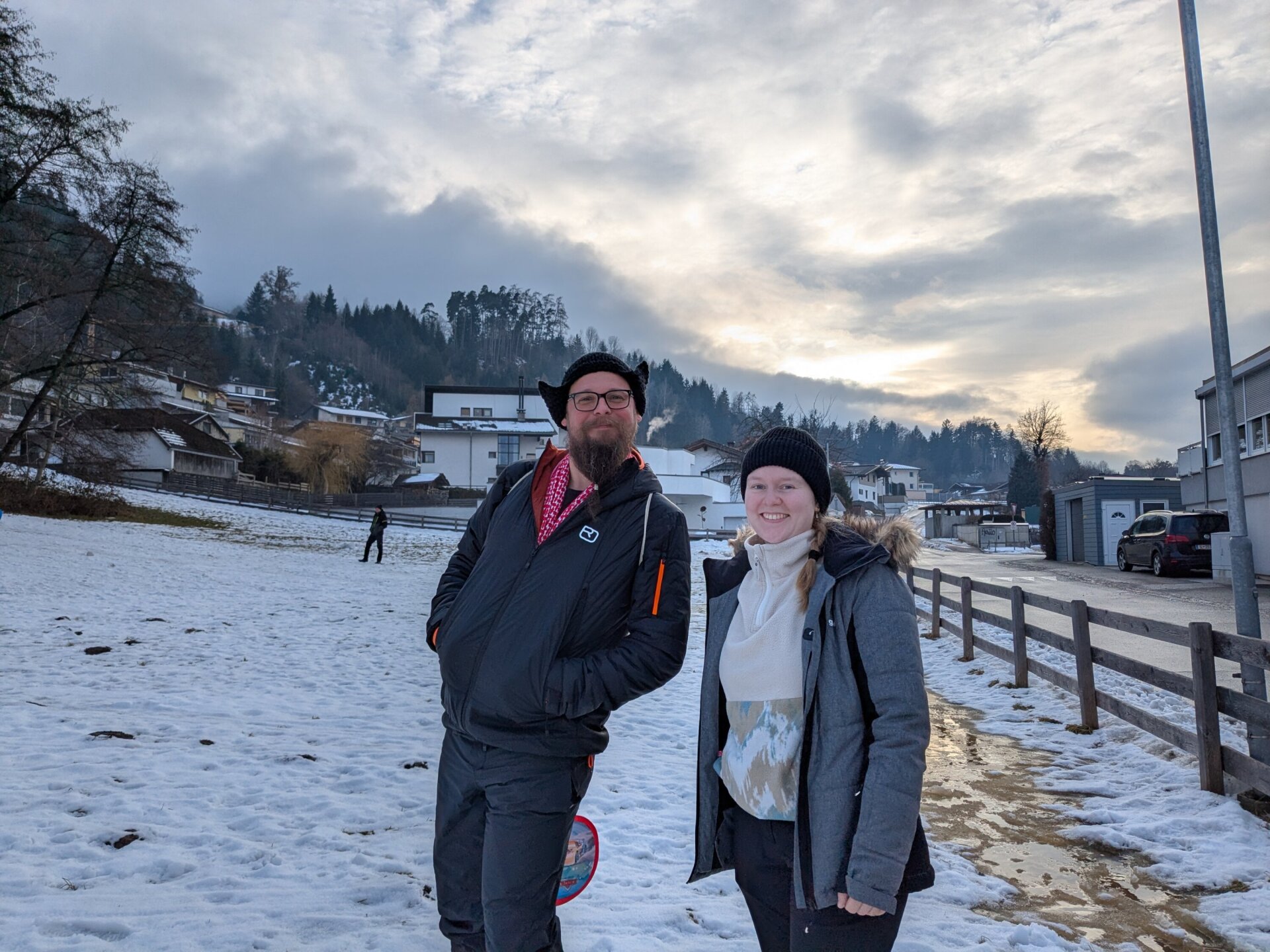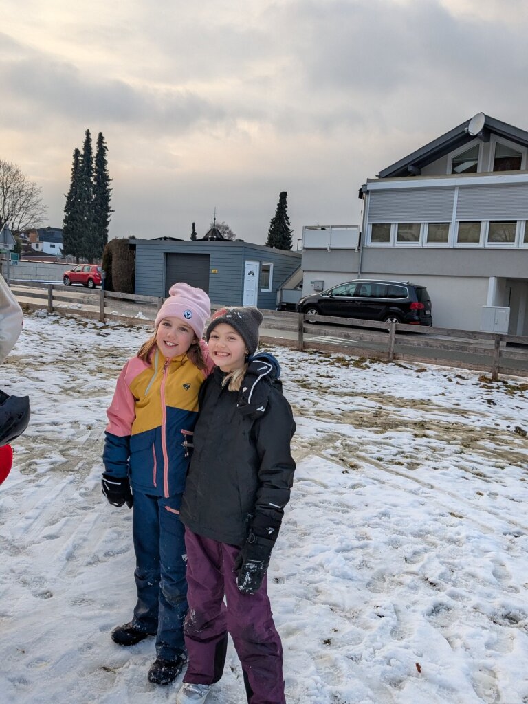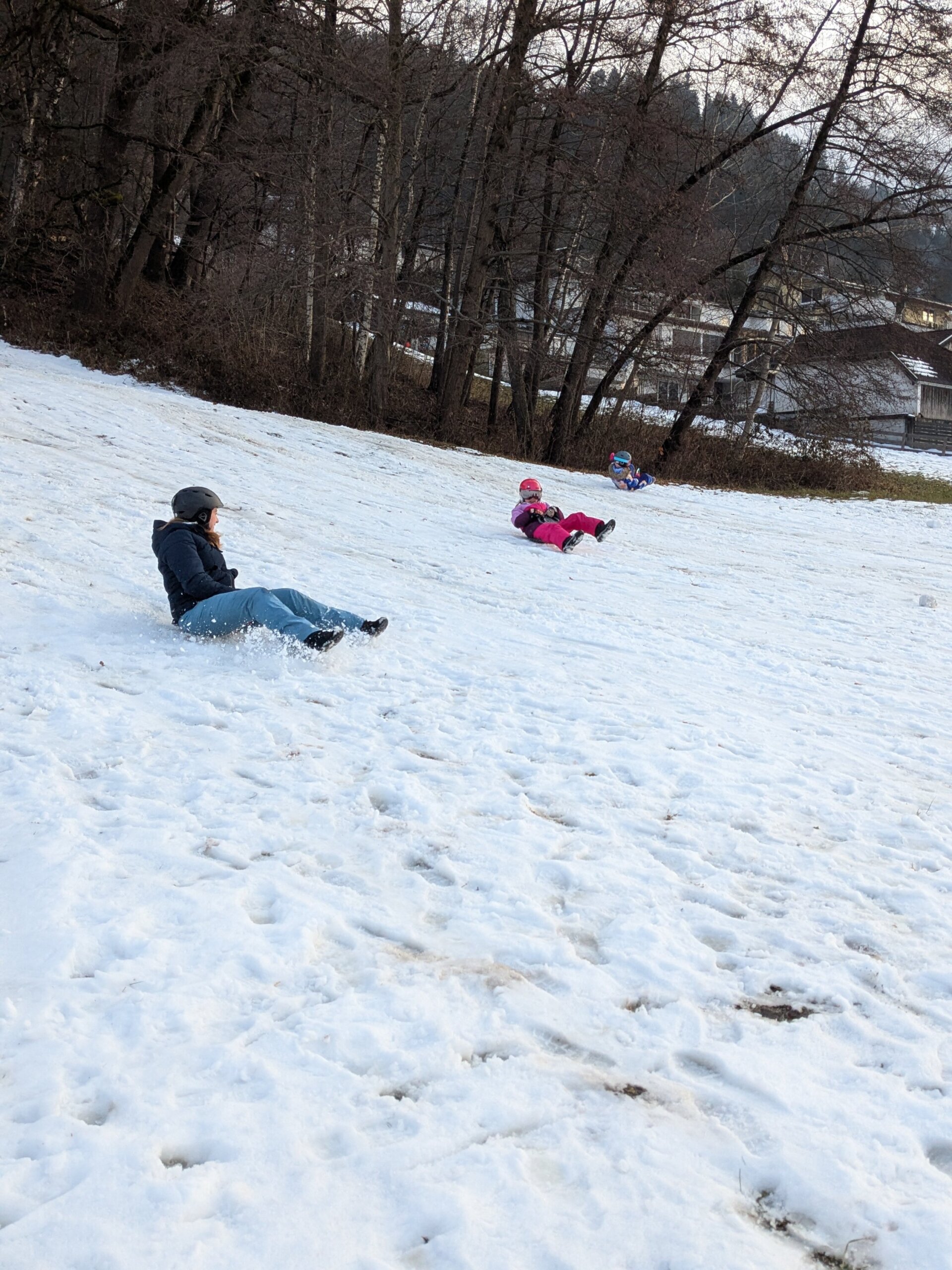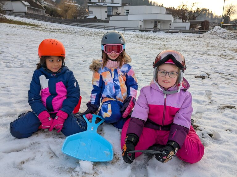 Unser Ziel war der Rodelhügel beim Schloss Aschach. Dort angekommen stellten wir fest, dass ein Großteil des Schnees bereits matschig war und sich auch einige kahle Stellen zeigten. Doch davon ließen wir uns die gute Laune nicht verderben. Wir machten das Beste aus der Situation und genossen die gemeinsame Zeit im Freien. 😄