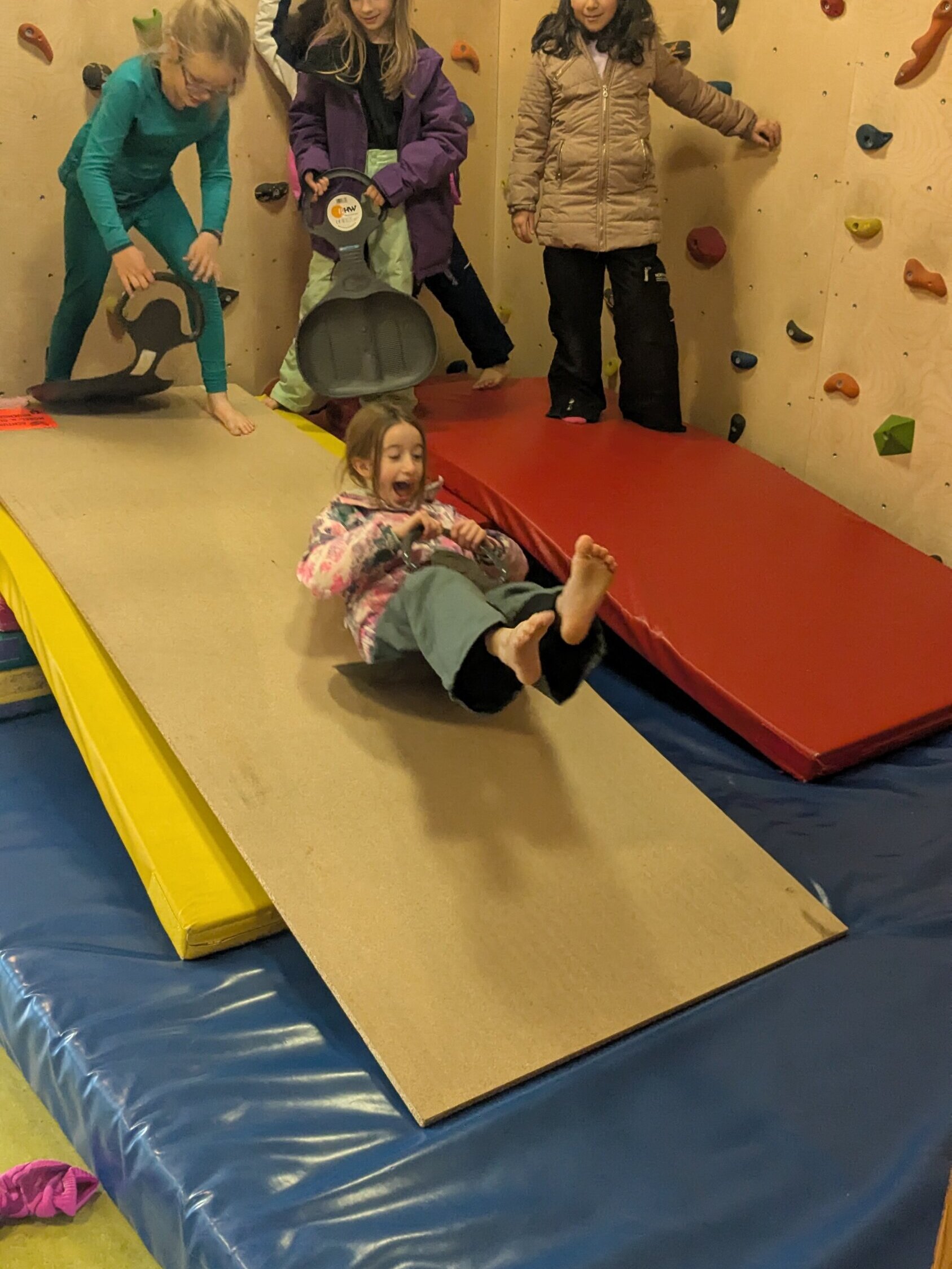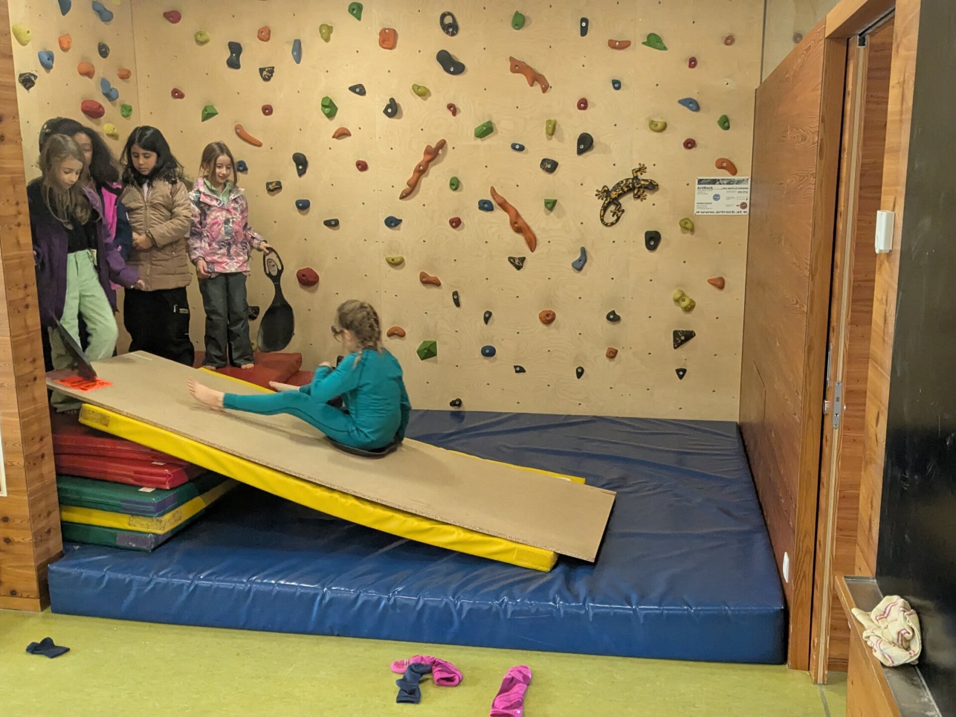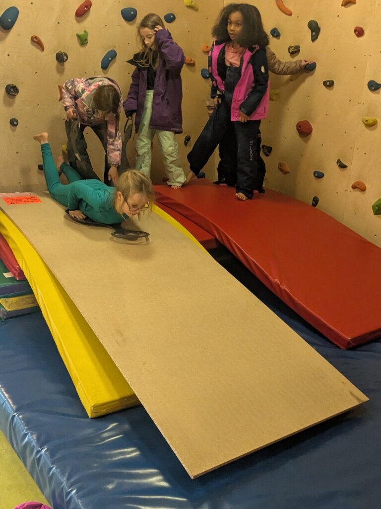 Mit großem Eifer zogen die Kinder ihre Skisachen an und verwandelten den Bewegungsraum in eine winterliche Spiellandschaft. Aus Turnmatten wurde eine Rutschstrecke gebaut, über die die Kinder nacheinander hinunterrutschten.