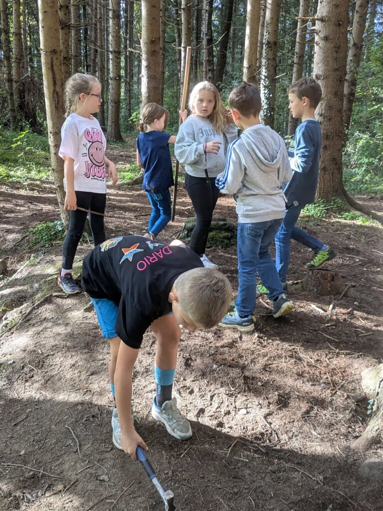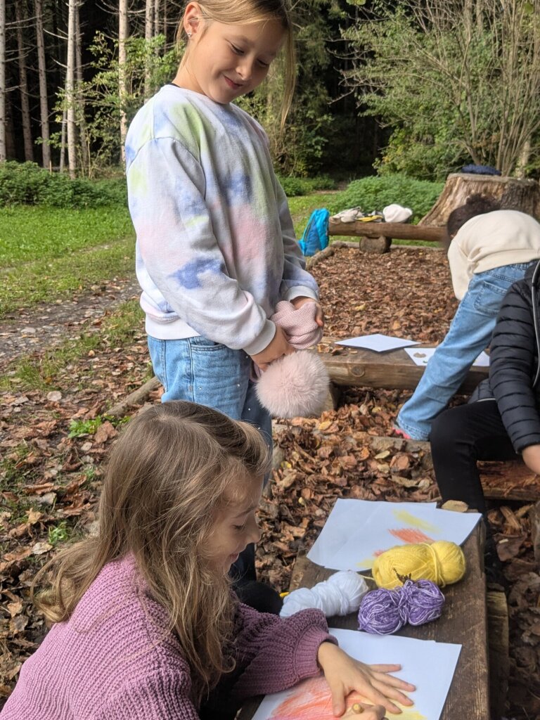 Auch an diesem Waldtag gab es wieder viel zu tun und zu entdecken. Während die einen Kinder in ein fantasievolles Rollenspiel eintauchten und den Wald dabei in ihre eigene kleine Welt verwandelten, waren andere fleißig am Basteln. Im Sonnenschein entstanden kunstvolle Spinnennetze und kleine Rahmen aus Ästen und bunter Wolle.